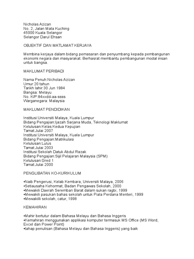Himpunan pelbagai contoh resume terbaik dan terkini resume bagus contoh resume resume kerajaan resume kerja kerajaan resume swasta resume kerja swastatips dan petua temuduga contoh surat pindah contoh surat iringan jenis surat surat berhenti kerja surat tukar kerja suka sama suka undang-undang buruh undang-undang kerja law buruh law. 19 Tahun Tarikh lahir. Contoh Resume Bahasa Melayu Kalau nak yang softcopy boleh email auni ok.
